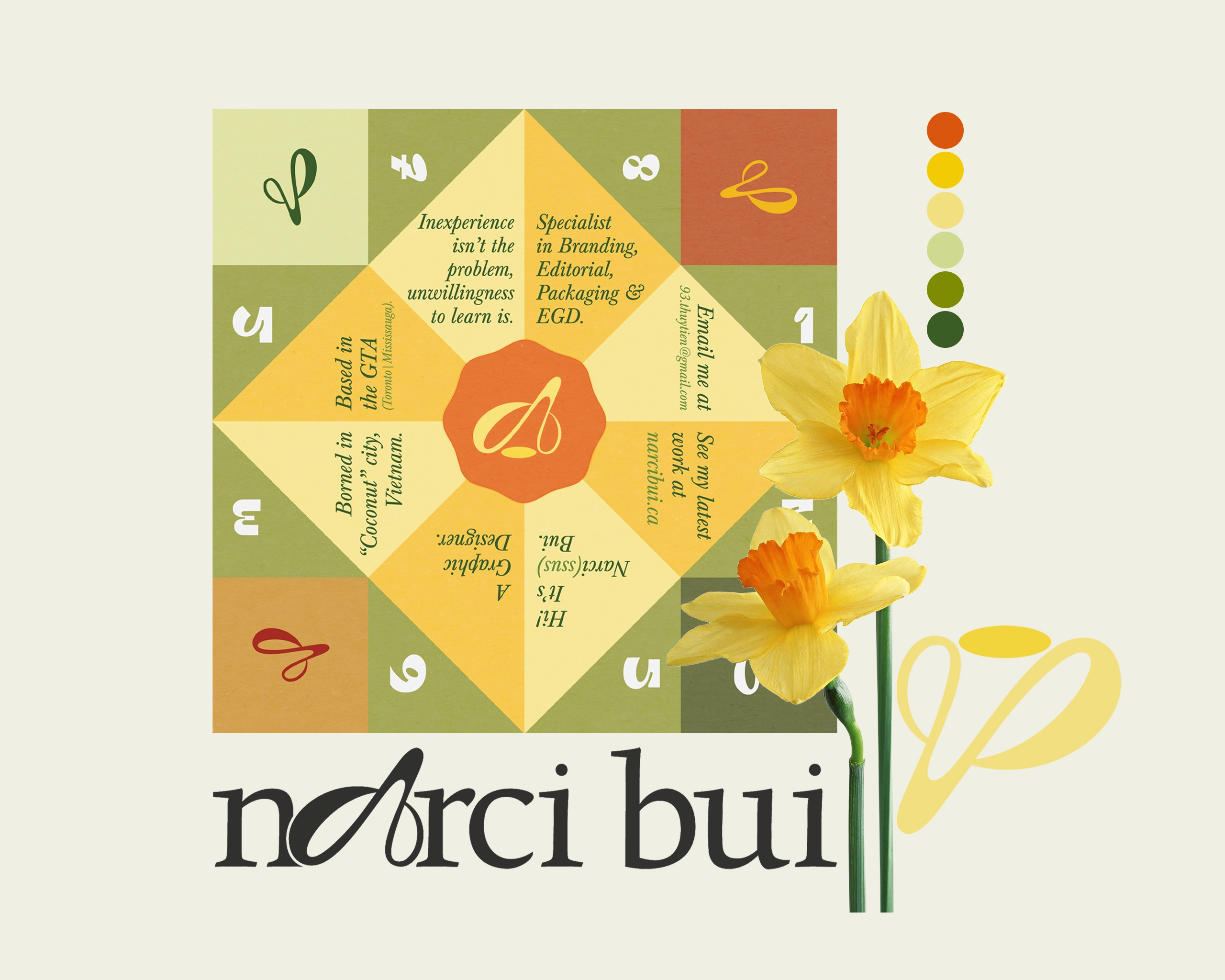 The heart of this design comes from my name, Thủy Tiên, which means "daffodil" (Narcissus). The colors and shapes you see, such as the warm yellows, organic greens, and the bright orange center, are all inspired by the natural beauty of this flower. Just as a flower blooms, this piece "unfolds" to tell my story.