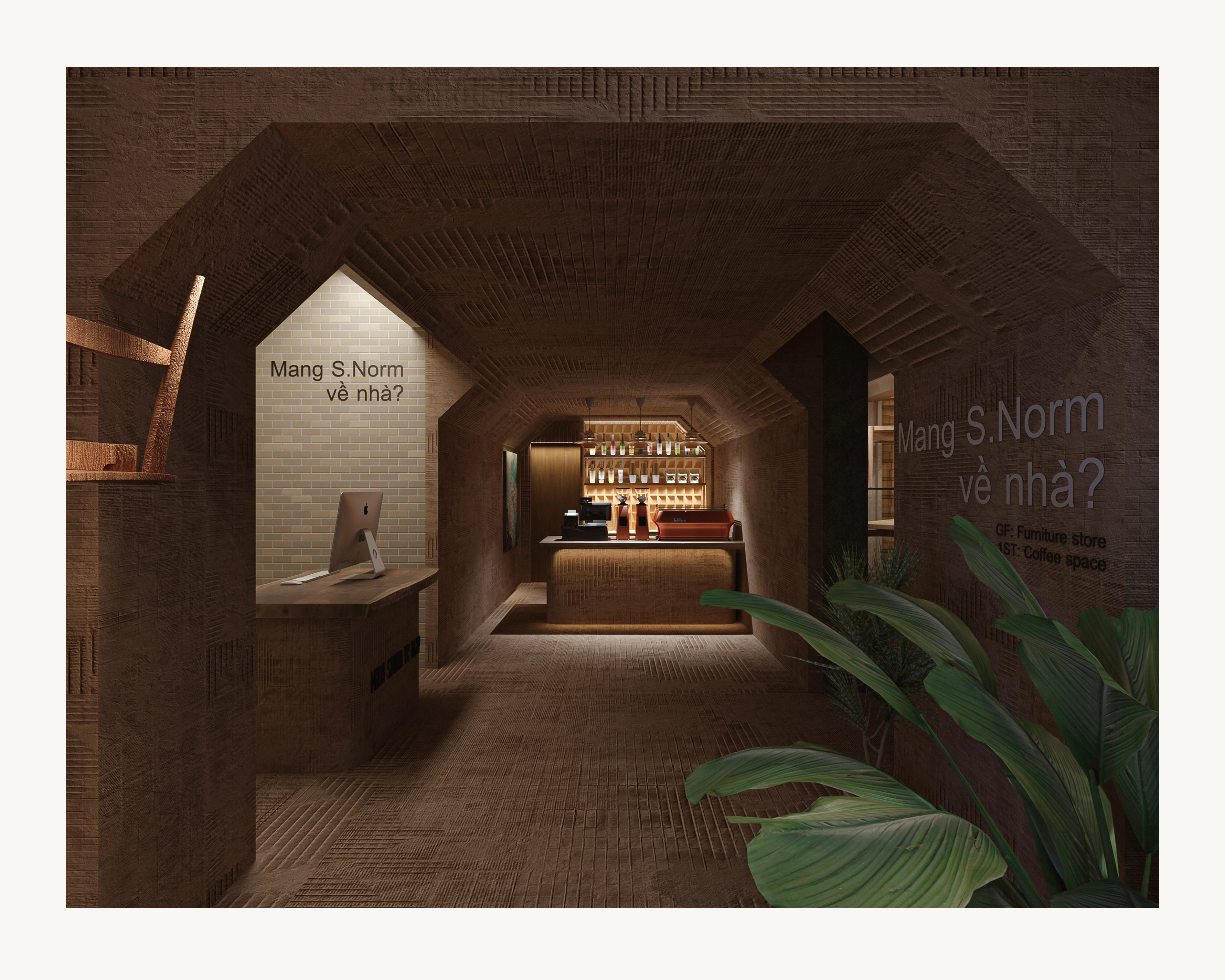 This interior design project marks my first exploration of environmental graphic design as a beginner, using graphics to support both function and spatial experience. At the façade, an introductory text is applied in white on the glass window, allowing customers to learn about the brand from the outside and encouraging them to step inside. This graphic layer also contributes to the overall aesthetic of the building. In the lobby, wayfinding elements such as “GF: Furniture Store” and “1ST: Coffee Space” are introduced to help customers easily understand the program of the space. In addition, the phrase “Mang Snorm về nhà?” (meaning “Bring Snorm home?”) is designed as a subtle call to action, encouraging customers to purchase furniture while also guiding them toward the showroom’s take-out counter.